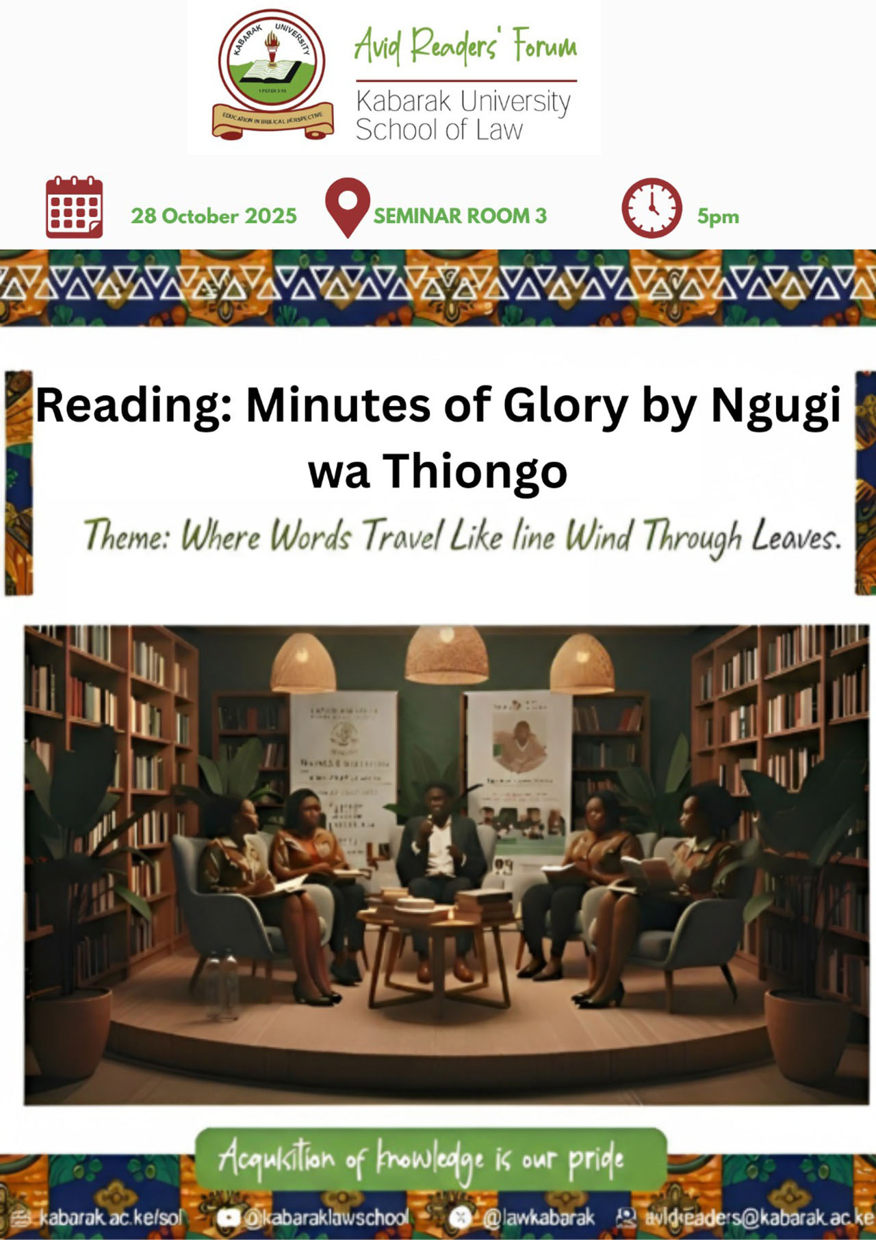 On 28th October, we read Minutes of glory, a short story by Ngugi wa Thiong’o. The session was led by Rebecca Muhindi, a fourth-year law student at Kabarak University. We began the session by a word of prayer, followed by a round of reading where everyone read a paragraph or two and then finally, we delved into the discussion before handing over to the coordinator and concluding with a word of prayer.