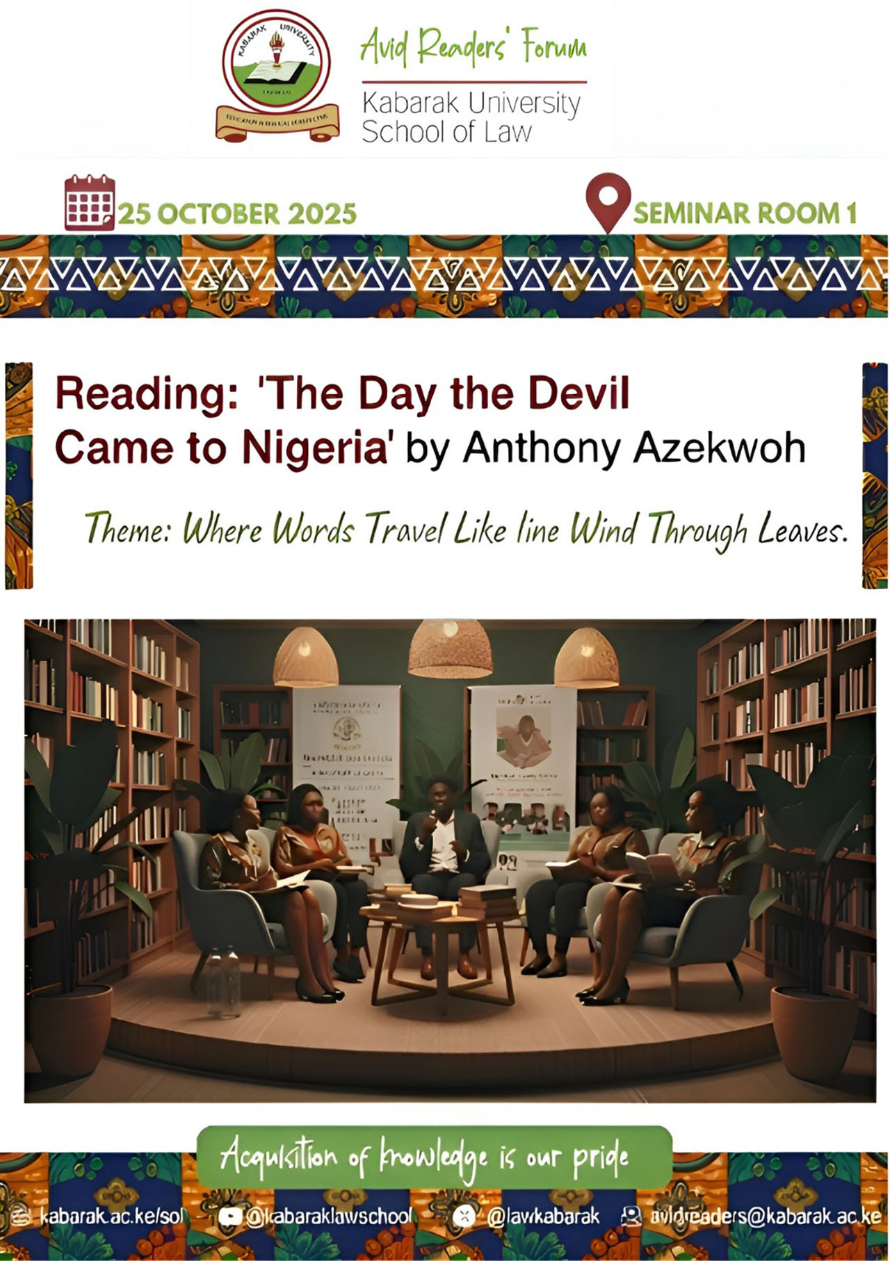 The Avid Readers Forum convened a reading and discussion session on Anthony Azekwoh’s short story “The day the devil came to Nigeria” on 25 September 2025. This session was led by Esther Blessing Nasimiyu and Victoria Okeke, two fourth year law students at Kabarak University, and attended by other participants including laws students. The session featured a collaborative reading of the story, where participants alternated in reading different sections aloud before moving into an analytical discussion.