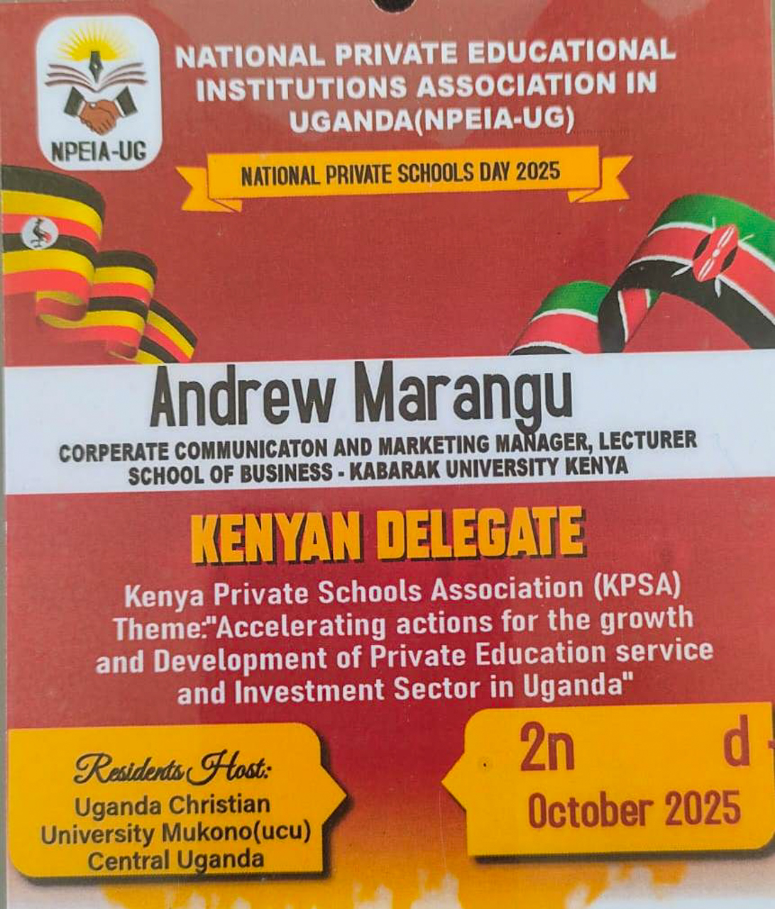 Kabarak University was represented by Mr. Andrew Marangu, our Corporate Communication and Marketing Manager. During the conference, he joined distinguished leaders, including the Vice-Chancellor of Uganda Christian University, the Director of Higher Education, and the Minister of Education, with whom he was captured in conversation and in warm handshakes, as the Kenya Private Schools Association (KPSA) Chair looked on. Another memorable moment was the Minister of Education officially greeting the Chair of the National Private Educational Institutions Association of Uganda — a gesture that symbolized strong collaboration across borders.