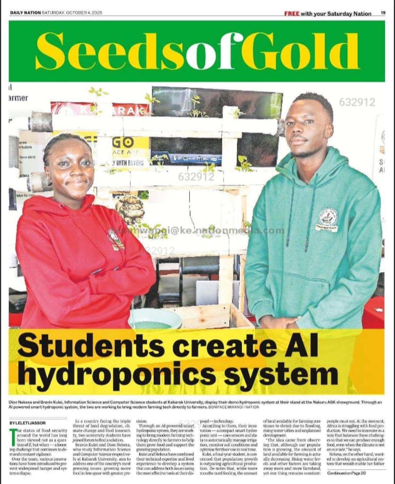 Two Kabarak University students, Dion Nekesa and Brian Kulei, have earned national recognition for their groundbreaking contributions to agricultural technology. Their invention — an AI-powered hydroponics system, was recently featured in the Daily Nation’sSeeds of Gold supplement on Saturday, October 4, 2025, following its successful exhibition at the Nakuru ASK Showground.