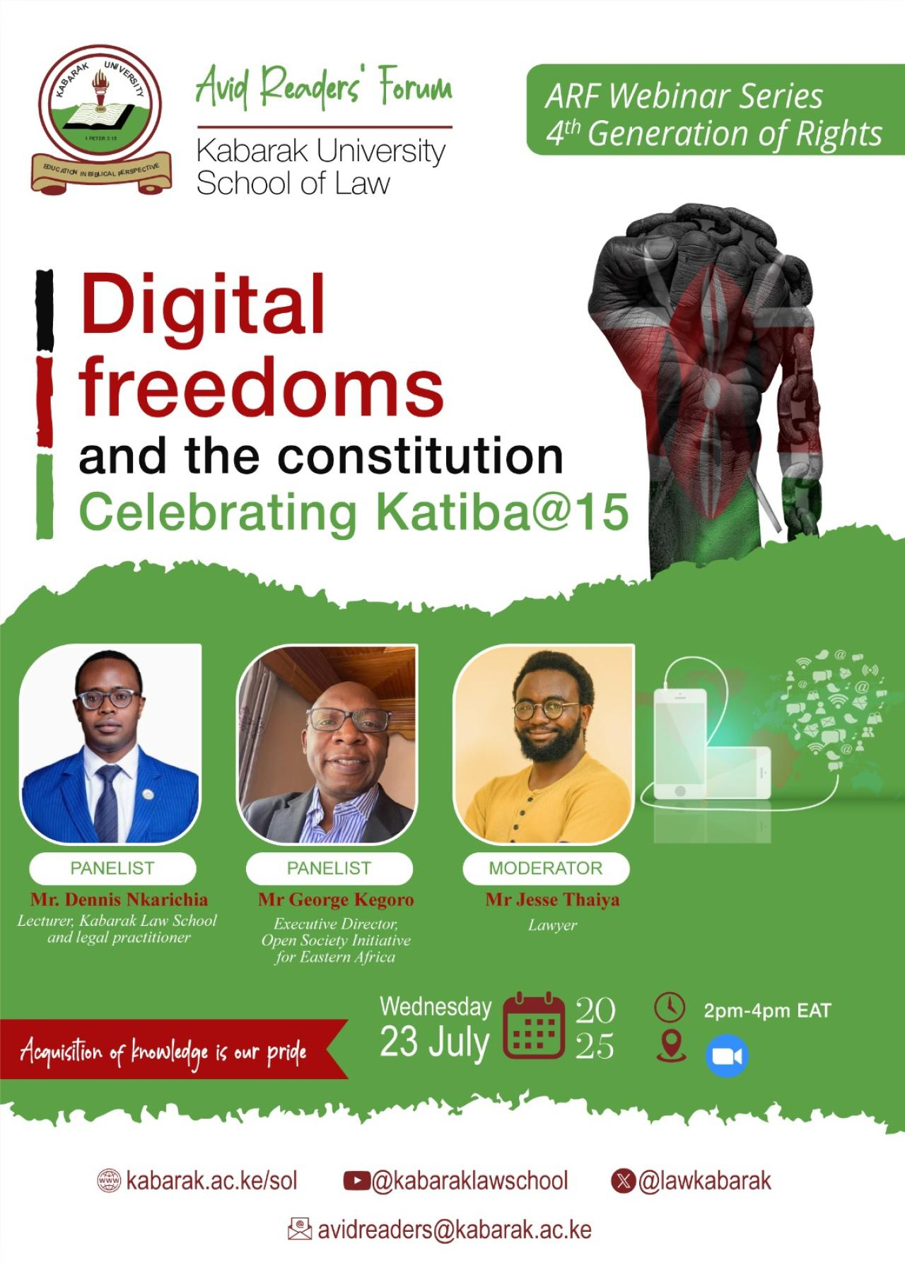 The Avid Readers Forum held on Wednesday, 23rd of July 2025, as part of the Katiba @15 series commemorating 15 years since the promulgation of Kenya’s 2010 Constitution, focused on the emerging domain of fourth-generation rights, particularly those related to the digital age. Moderated by Mr Thaiya Jesse, the session featured two panelists: Mr. George Kegoro, Executive Director of the Open Society Initiative for Eastern Africa, and Mr. Dennis Nkarichia, an associate at Mohammed Muigai LLP and a lecturer at Kabarak Law School. Their discussion explored how Kenya’s 2010 Constitution accommodates evolving digital rights, the legislative and jurisprudential strides in this area, and the challenges that remain, particularly around trust, access, and accountability in digital governance.