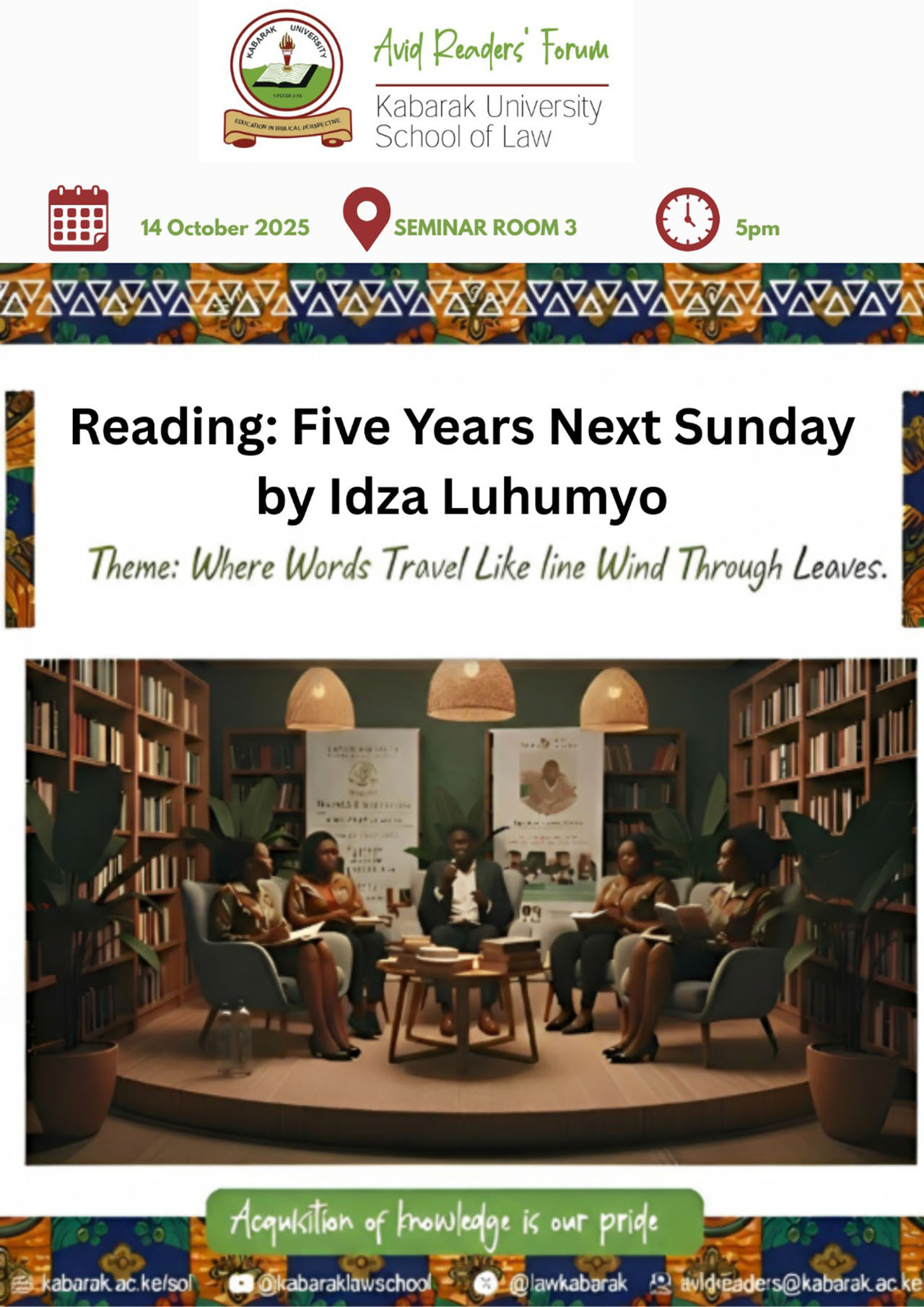 On 14 October 2025, the Avid Readers Forum convened for a reflective reading and discussion of Idza Luhumyo’s short story Five Years Next Sunday. The session was moderated by Asheen Chepkosgei and attended by law students and a faculty member, drawn by the story’s haunting exploration of scarcity and survival. Participants engaged in a collective reading, moving through the narrative in turns before interrogating its themes, symbolism, and moral questions. The session sought to unpack how fiction mirrors social realities in which human dignity is continually negotiated against material need.