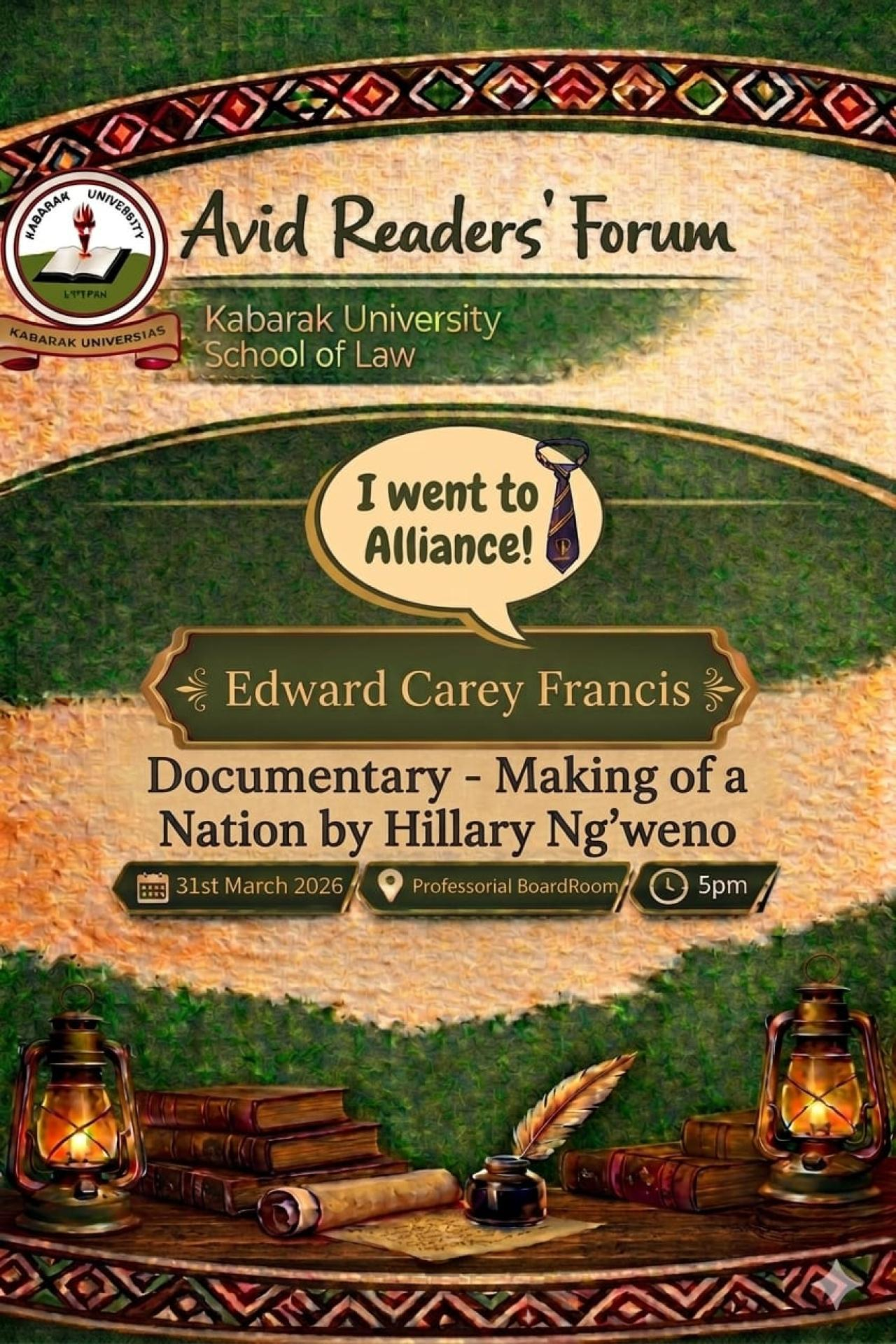 On Tuesday, 31st March, 2026, we, the members of the Avid Readers Forum converged at the Professorial Boardroom in our prestigious law school for the final Agora session of the semester. The meeting featured an audio-visual presentation, ‘Making of a Nation’, a documentary by Hillary Ng’weno centered on the legacy of Alliance High School (AHS) and its long-term impact on Kenyan governance. We held a discussion on the historical influence of Alliance High School on the leadership and political landscape of Kenya, noting that AHS celebrated its centenary on 1st March, 2026.