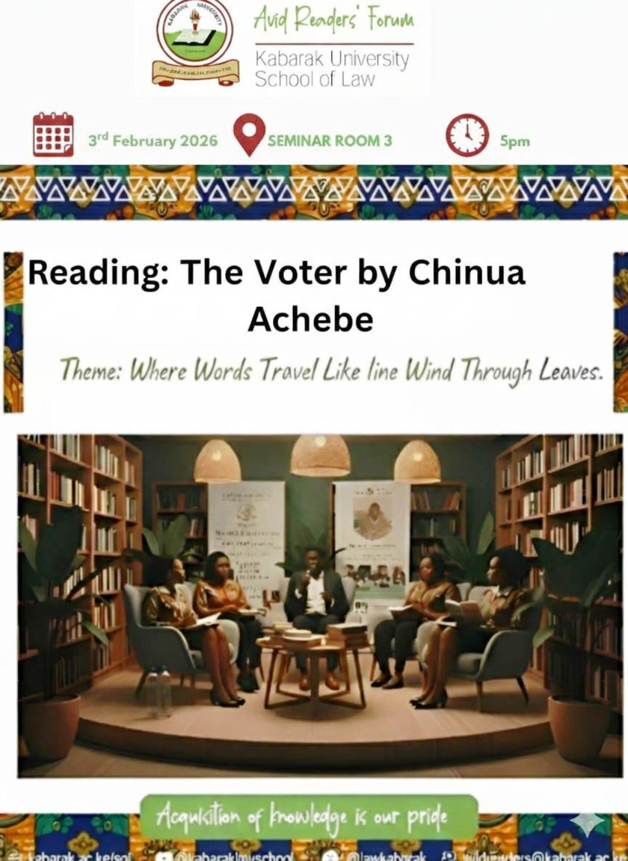 The Avid Readers Forum held its inaugural session this year on 3 February 2026. This session was moderated by Ms Victoria Okeke, the student coordinator and the lead reader. The selected text for the session was Chinua Achebe’s The Voter, a critique of the state of electoral politics in post-independence Africa. Before the reading, Barbra Chemwachar offered a brief background of Achebe, casting a spotlight on his central position in African literature. He is widely regarded as the father of modern African literature. Born on 16 November 1930 in Ogidi, Nigeria, Achebe was a novelist, poet and critic whose works profoundly shaped modern African storytelling. His first novel and magnum opus, things Fall Apart, remains one of the most influential African texts globally. She also shared two of his famous quotes, “If you don’t like someone’s story, write your own,” and “The world is like a mask dancing. If you want to see it well, you don’t stand in one place.”
