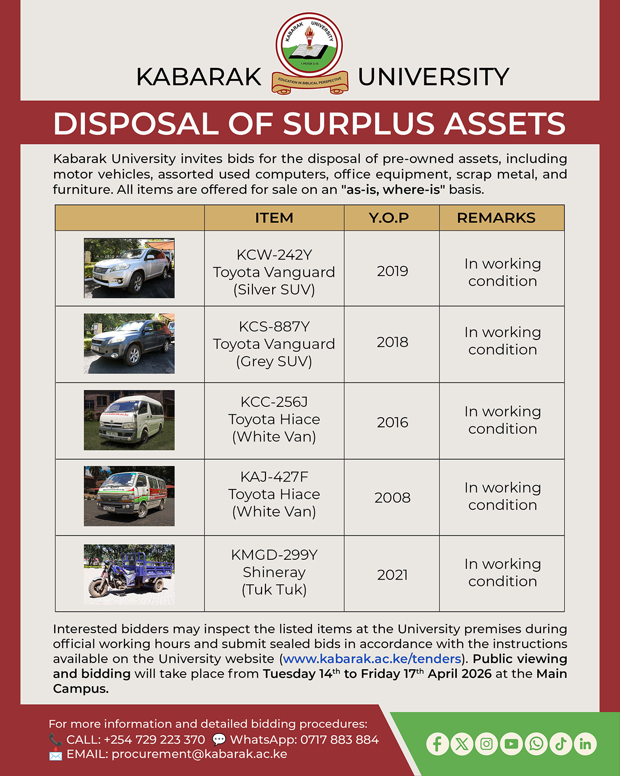 - Bid Forms: Detailed disposal bid forms can be downloaded from the university website at www.kabarak.ac.ke/tenders.