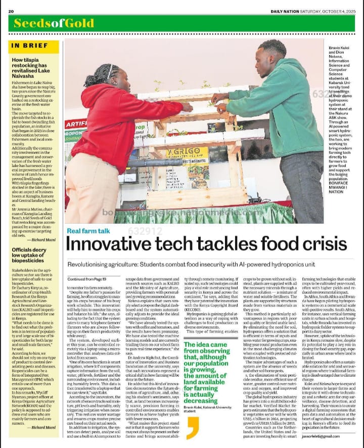 Two Kabarak University students, Dion Nekesa and Brian Kulei, have earned national recognition for their groundbreaking contributions to agricultural technology. Their invention — an AI-powered hydroponics system, was recently featured in the Daily Nation’sSeeds of Gold supplement on Saturday, October 4, 2025, following its successful exhibition at the Nakuru ASK Showground.