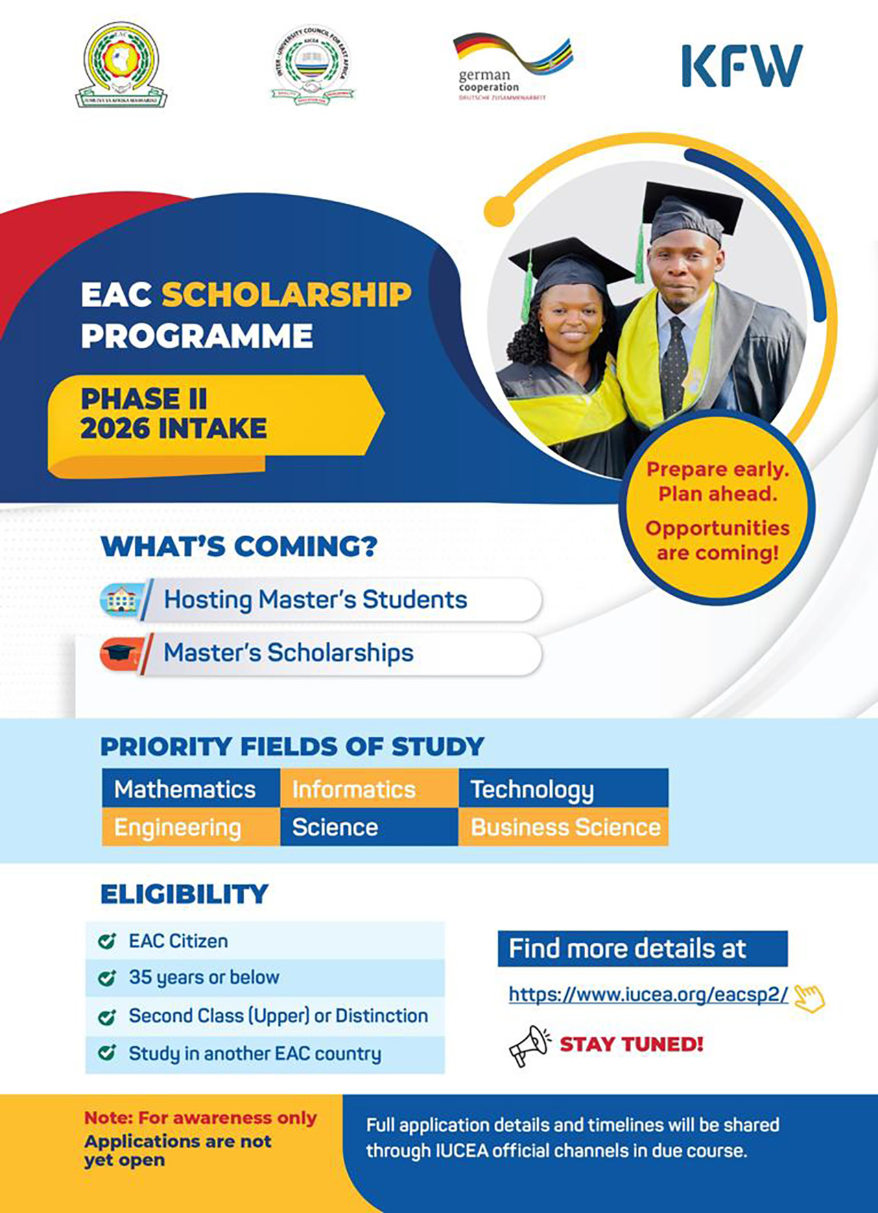 Kabarak University wishes to inform prospective postgraduate students and the university community of the upcoming East African Community (EAC) Scholarship Programme – Phase II, 2026 Intake, coordinated by the Inter-University Council for East Africa (IUCEA) with support from development partners.