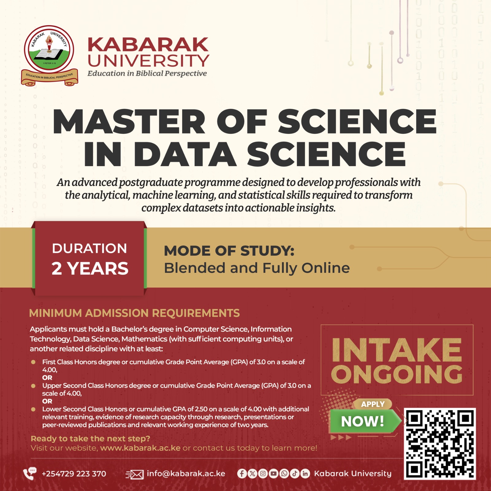 The Master of Science in Data Science at Kabarak University is an advanced postgraduate programme designed to develop experts capable of transforming data into actionable insights. As organizations increasingly rely on data-driven decision-making across all sectors, this programme equips learners with cutting-edge analytical, computational and research skills necessary to solve real-world problems through data.